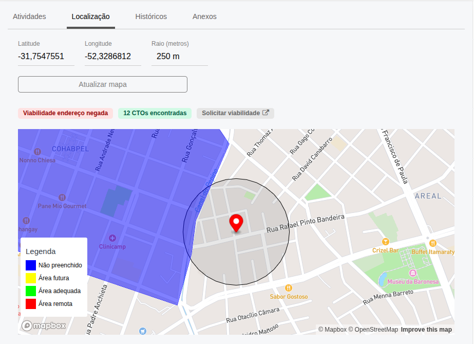 Você pode solicitar viabilidade para o cliente. Dentro do card do cliente, na seção de Localização, você poderá ver o local de instalação do cliente com a área de cobertura mais pŕoxima. Clicando em Solicitar Viabilidade você poderá enviar o caso do cliente para o setor responsável, atrelando uma sub região próxima do local de instalação.