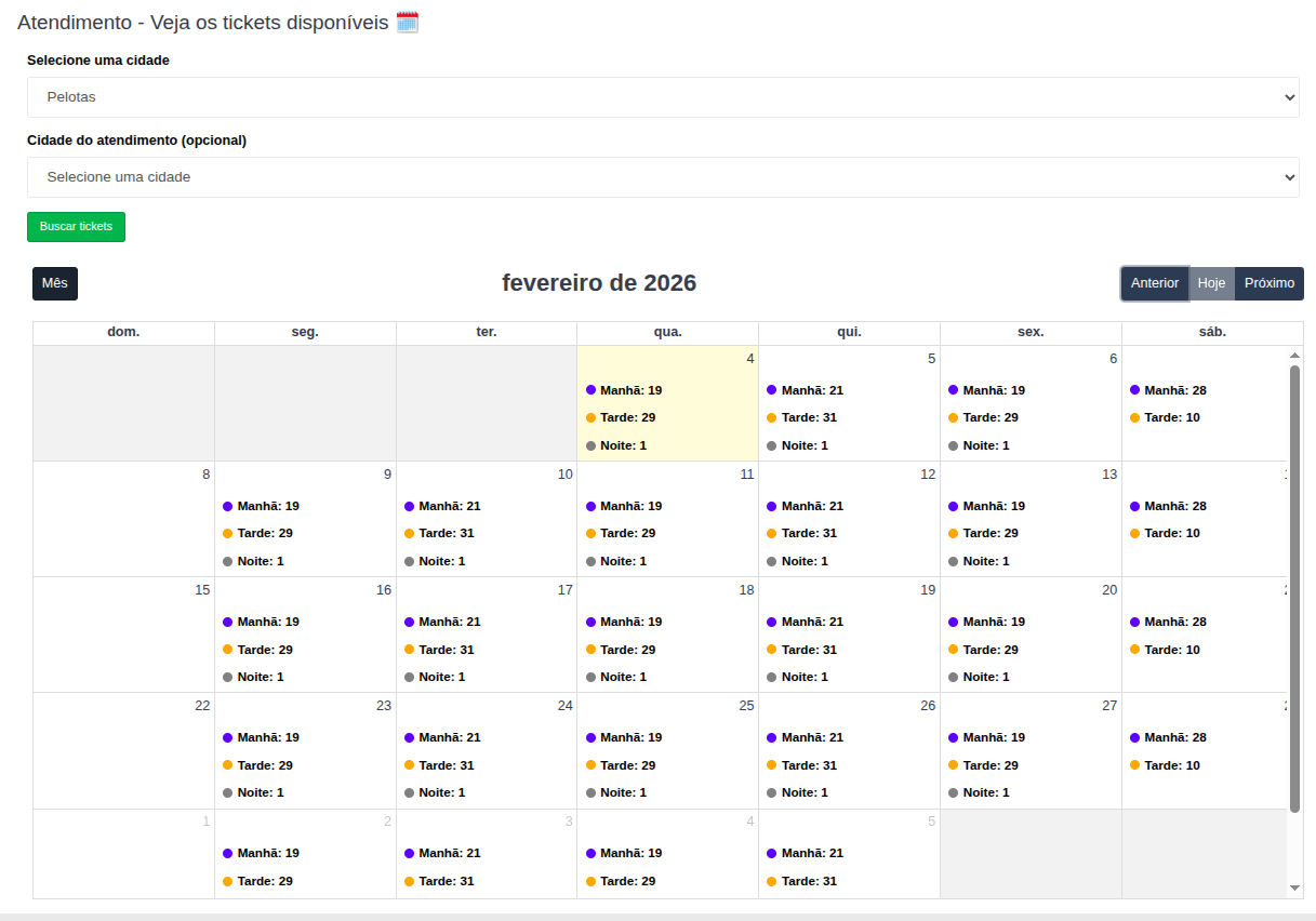 Ao realizar a busca por uma cidade, cada dia no calendário apresentará a contagem de tickets disponíveis dividida por turnos, identificados por cores: