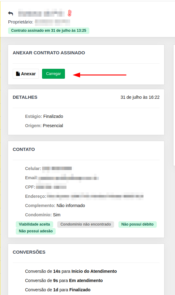 Dessa forma, a tela de lançamento de venda irá esperar você anexar o contrato do cliente no card para prosseguir e passar para o status “Finalizado”.
