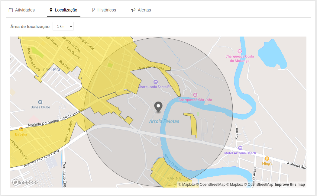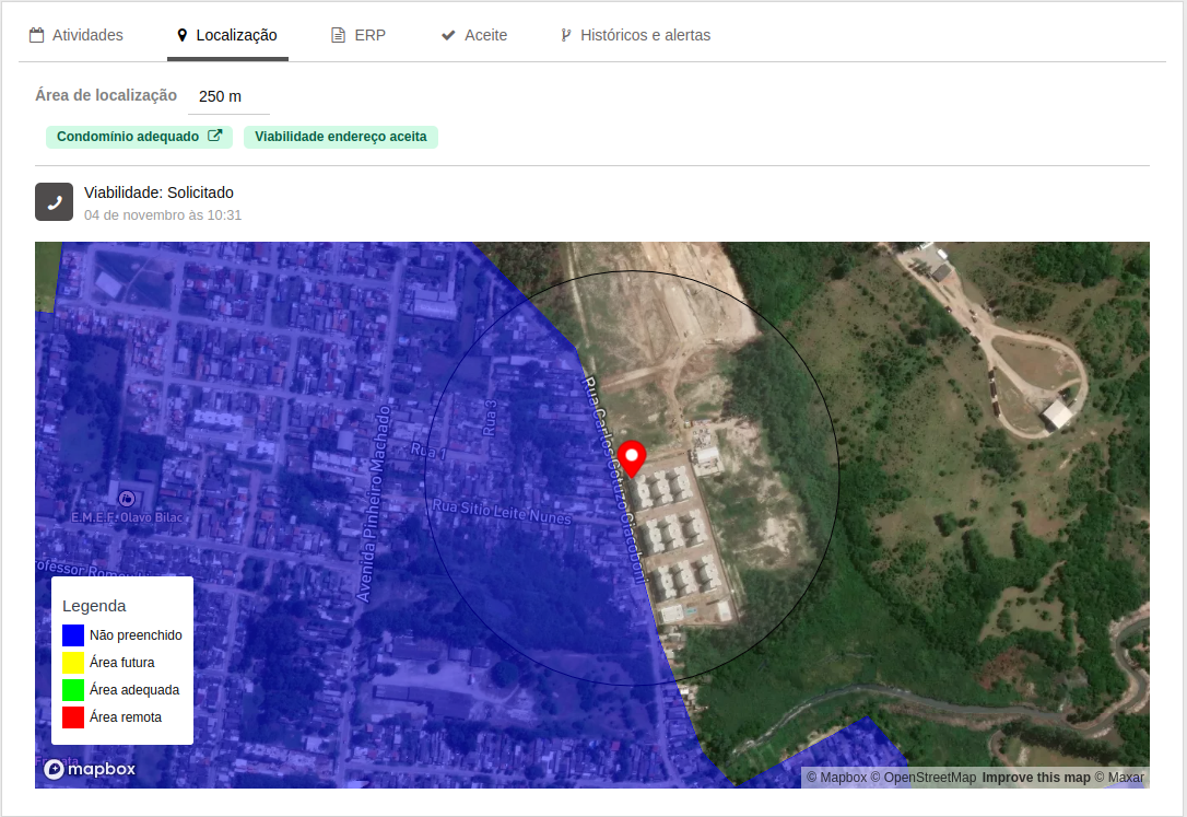 Aba designada a mostrar o local de instalação do cliente através do pin e sua região através do polígono em volta.
