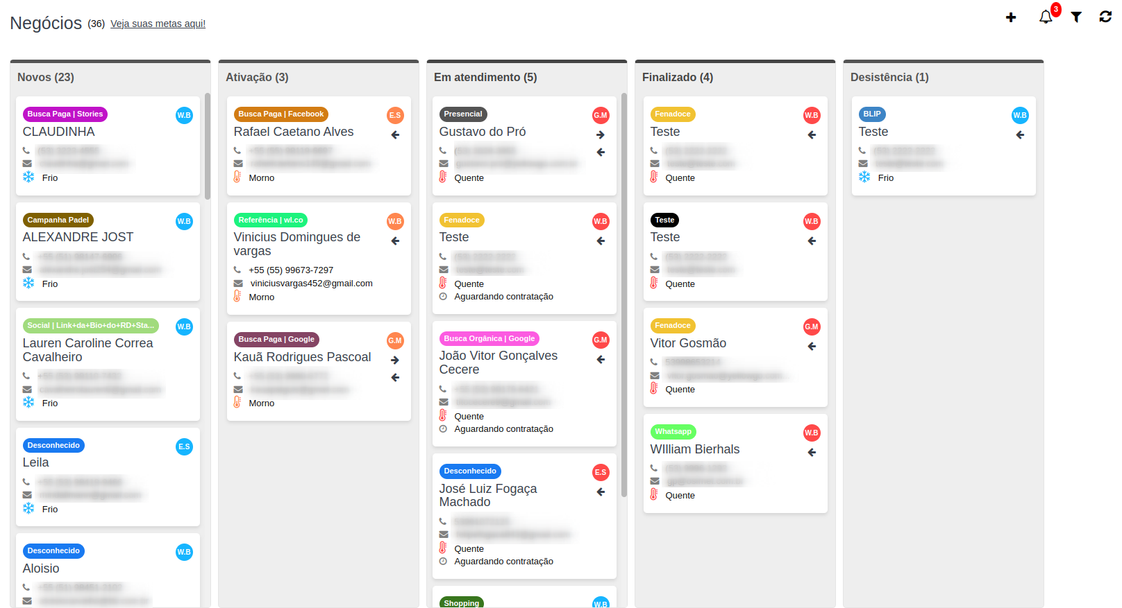 A tela de Negócios mostra todos os clientes que foram importados através das origens, integrações por APIs e cadastros através desta tela clicando no ícone de Adicionar Negócio. O quadro Kanban é dividido em cinco etapas configuráveis pelo usuário, onde todos os novos cards cadastrados irão para a primeira fase e poderão ser movidos sobre as demais.