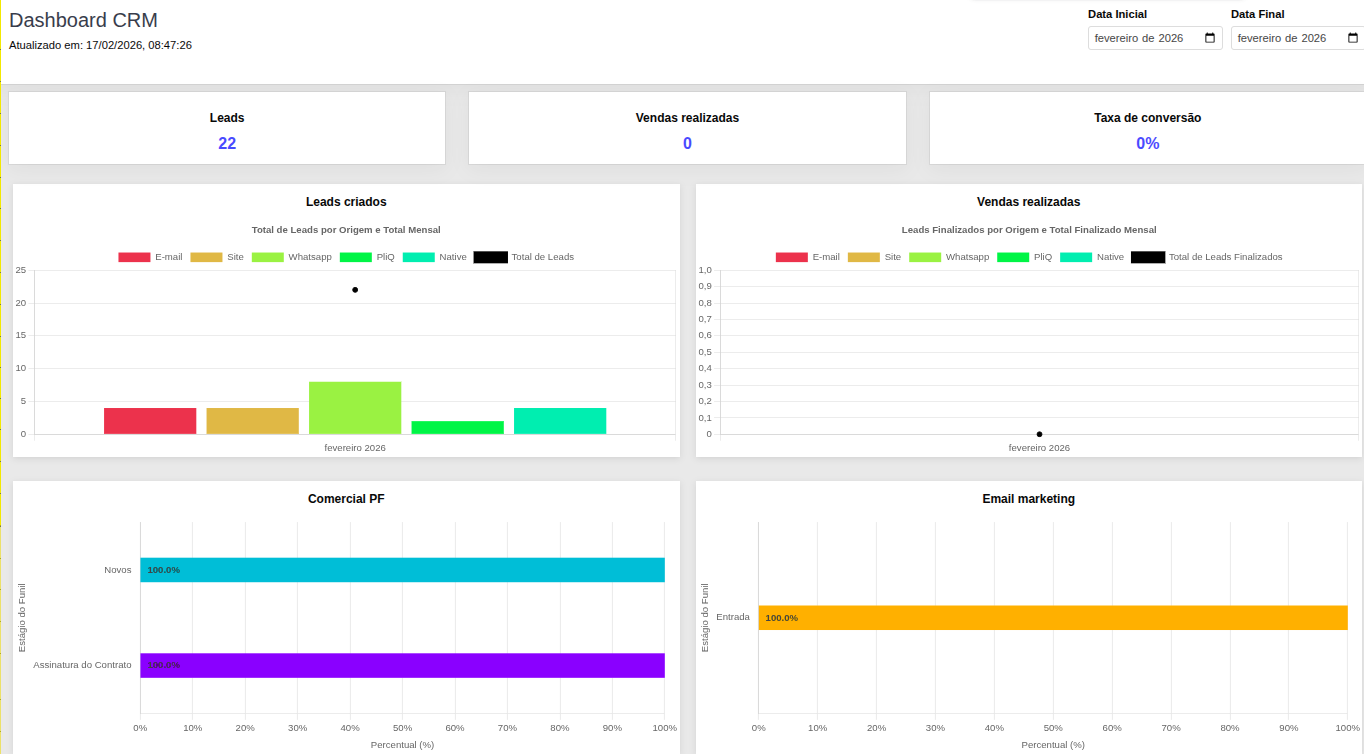O Dashboard CRM tem como objetivo monitorar o funil de vendas, permitindo a análise da origem dos leads e a eficiência da equipe.