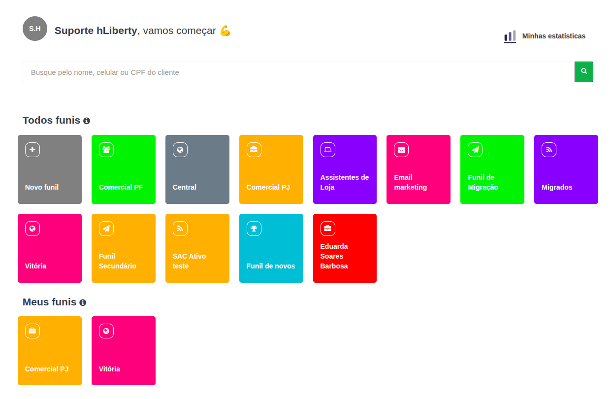 A tela de fluxos da plataforma é o dashboard central para a gestão de processos. A interface utiliza um sistema de cartões coloridos e ícones para facilitar a navegação rápida entre diferentes departamentos e tipos de clientes.