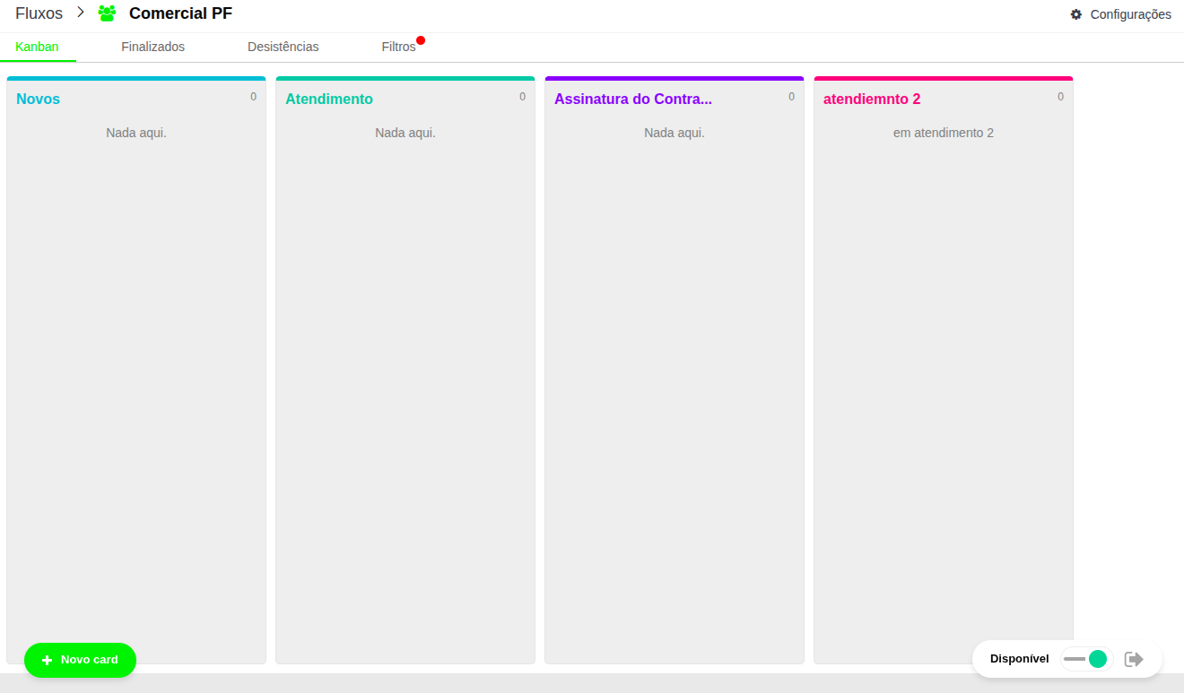 Dica de Operação: Sempre verifique o botão de Disponibilidade ao iniciar o turno de trabalho para garantir o recebimento correto de novas demandas do funil.