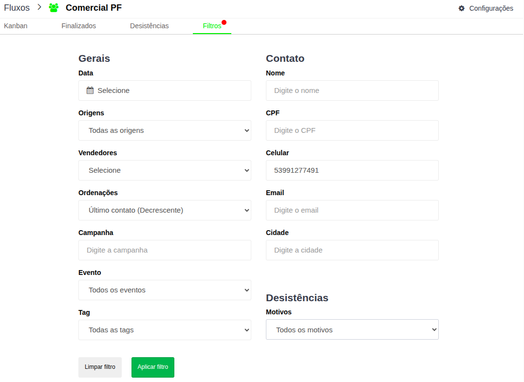 A aba Filtros permite uma segmentação granular das negociações baseada em múltiplos critérios: