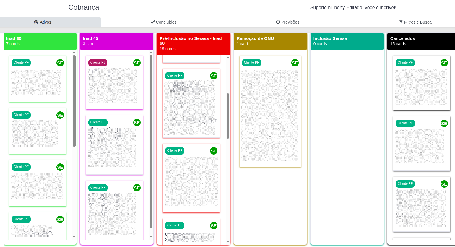 É a tela operacional principal, onde os cards dos clientes são movidos através das réguas de cobrança (Inad 30 até Cancelados).
