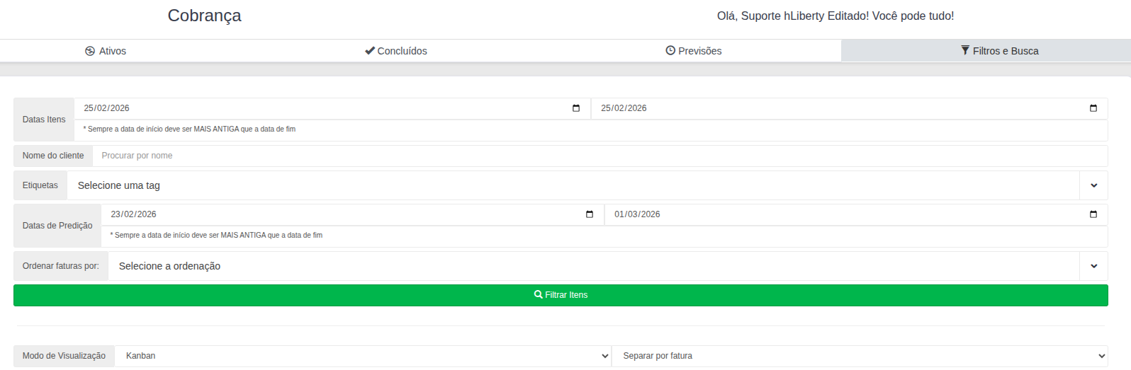 O Módulo de Cobrança é a ferramenta central de gestão de inadimplência do sistema, estruturada em um modelo de Pipeline (Kanban). Ele permite o acompanhamento visual e cronológico de clientes com débitos pendentes, desde o atraso inicial até a negativação e cancelamento.