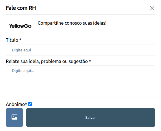 Na aba Fale com RH é possível relatar ideias, problemas e sugestões — tanto de forma anônima quanto notória — para o setor de Recursos Humanos da empresa. Este recurso pode ser personalizado na página Fale com o RH onde é possível determinar a imagem que irá aparecer no modal ao ser clicado juntamente com seu texto. Clicando em Detalhes o usuário poderá abrir o chat com o colaborador que criou uma solicitação através desta funcionalidade.