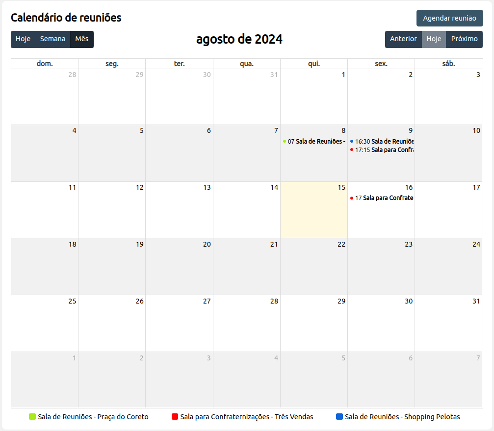 Ao acessar a página de Agendamento de Reuniões, o usuário poderá visualizar todas as reuniões agendadas no local de trabalho escolhido, além das reuniões em que foi convidado. Para visualizar a agenda de reuniões, deve-se selecionar a cidade de escolha, o local de trabalho e, caso necessário, a sala que gostaria.