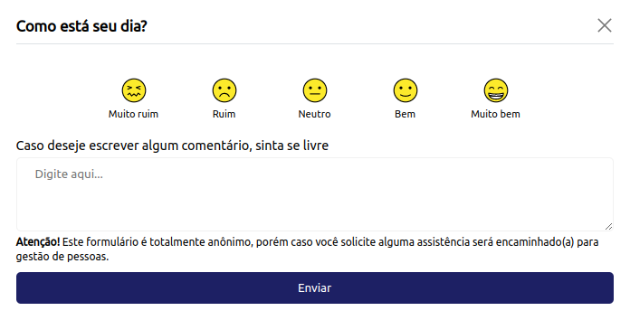 Na página inicial do RH Digital, no primeiro login diário, um formulário anônimo irá aparecer perguntando ao colaborador como está seu dia. Este formulário possui o intuito de criar indicadores sobre a moral geral dos setores da empresa. Ajuda a monitorar e melhorar o bem-estar dos colaboradores, permitindo intervenções rápidas quando necessário. Além disso, caso o colaborador precise de assistência, é possível marcar a opção que envia uma notificação para o setor responsável para que haja uma tratativa do caso.