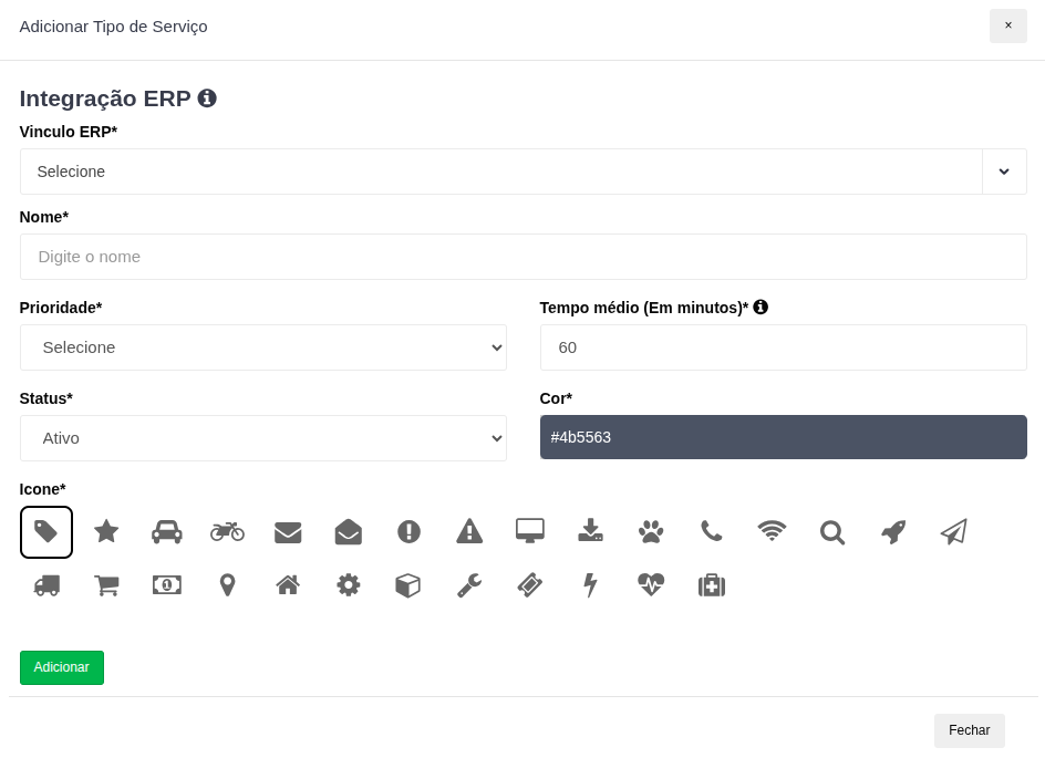 | Serviço | Tipo de Serviço | Select | Define a categoria da O.S (Instalação, Reparo, Manutenção, etc). |