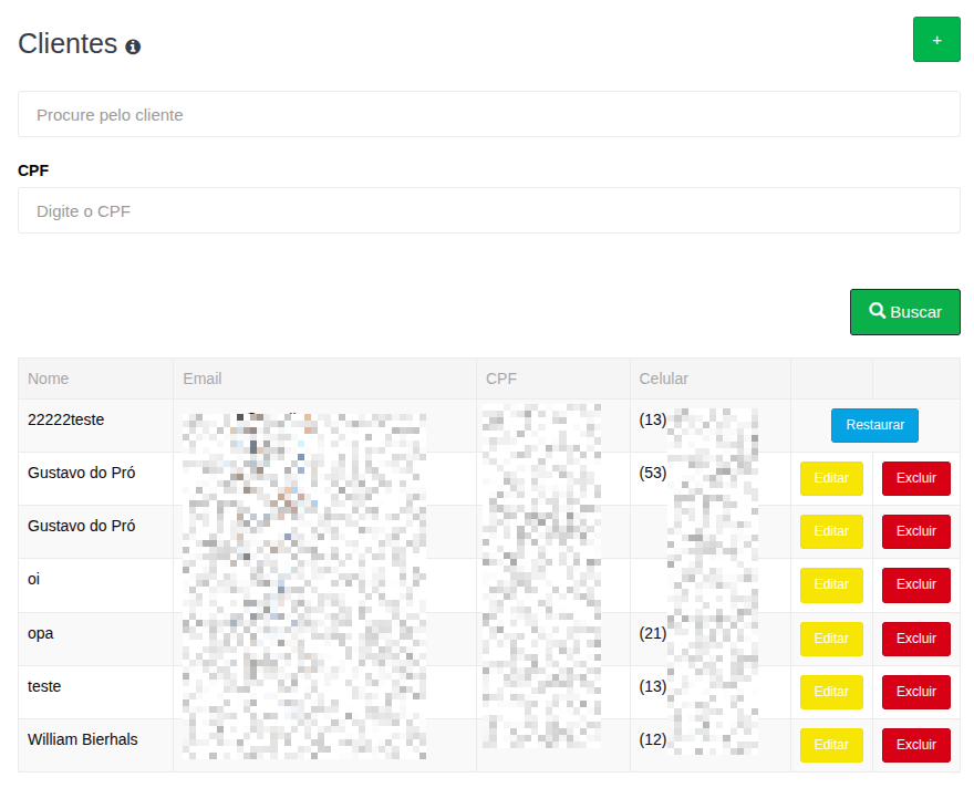 - Tabela de Dados: Exibe colunas de Nome, Documento, Telefone e Localidade.