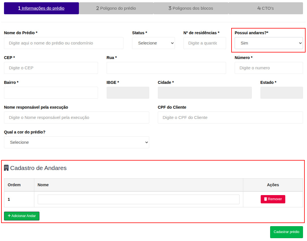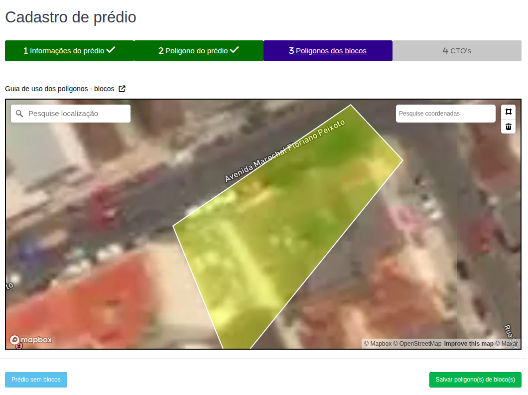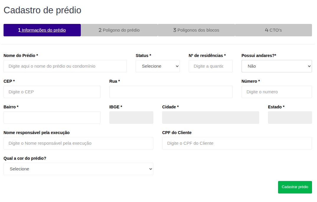 Ação: Ao preencher todos os campos obrigatórios, clique no botão "Cadastrar prédio" para habilitar as etapas de georreferenciamento (Polígonos).
