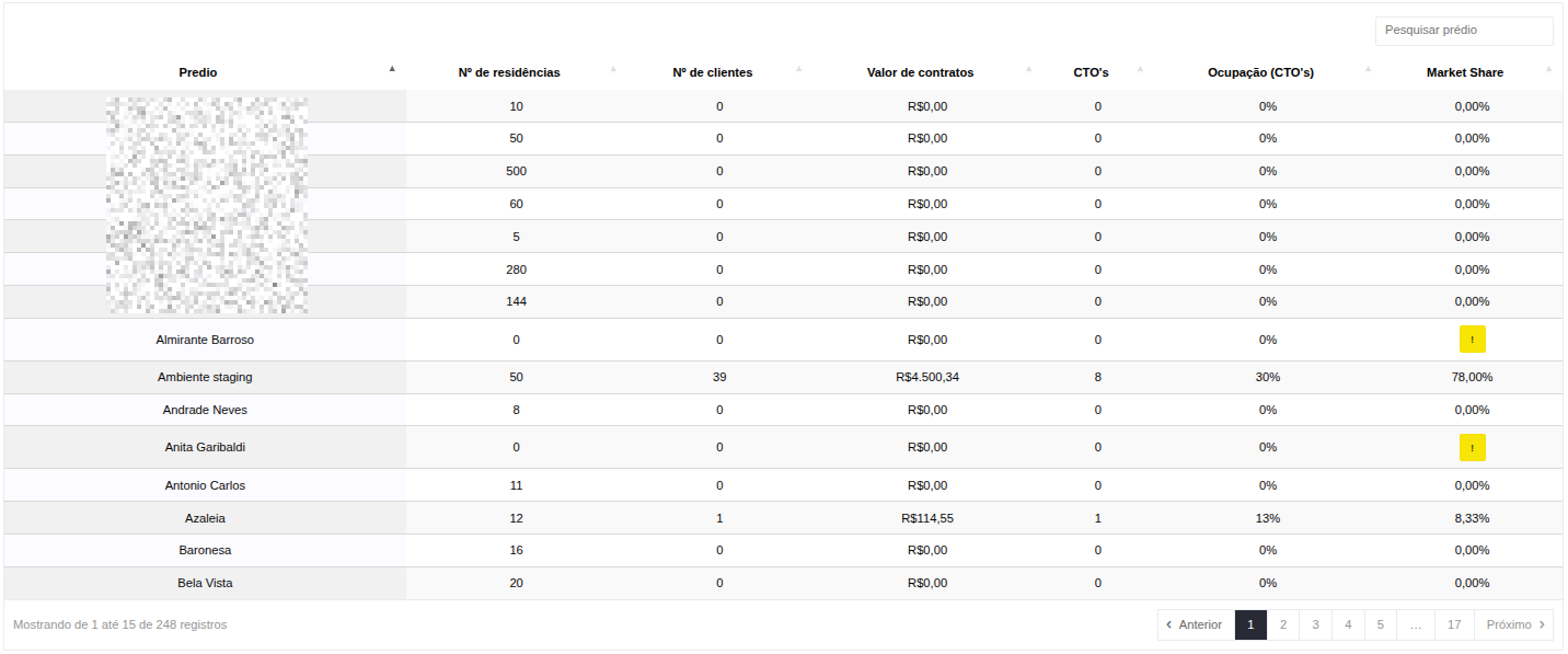O módulo de prédios visa monitorar a ocupação, o status de adequação e o market share dos registros. Além disso, permite vincular CTOs aos polígonos (prédios ou blocos), calculando a ocupação com base nas conexões reais.