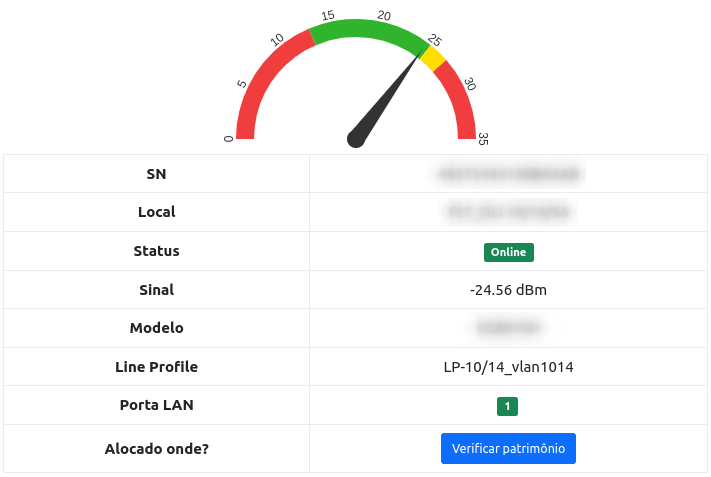 Nesta página é possível consultar equipamentos ONU das suas informações de número de serial. Consultando o equipamento, é possível visualizar demais informações como sinal da fibra, local, status, modelo, line profile, porta LAN e verificar seu patrimônio.